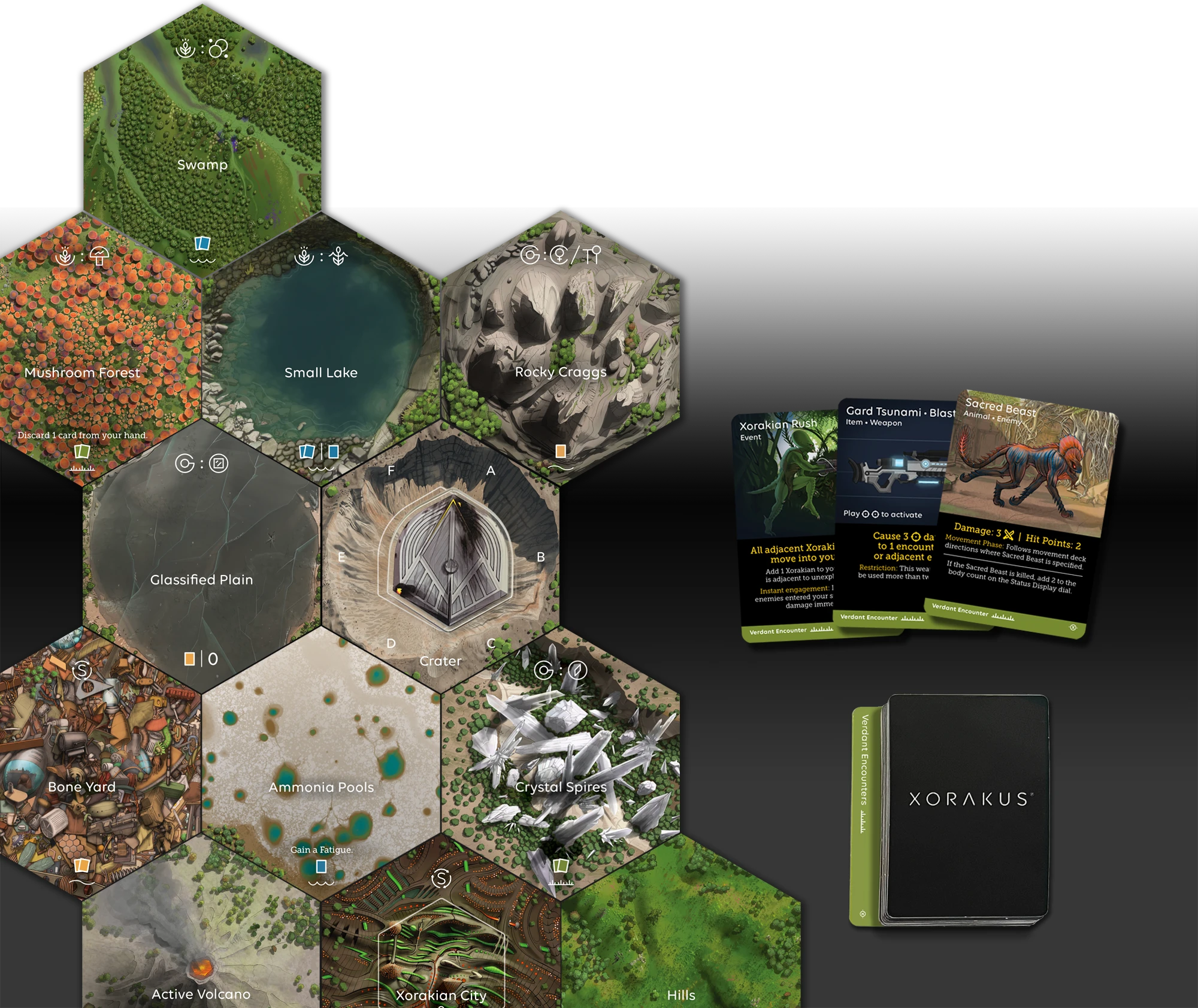 Plus, new item and encounter cards, terrain tiles, and Camouflaged Xorakians.